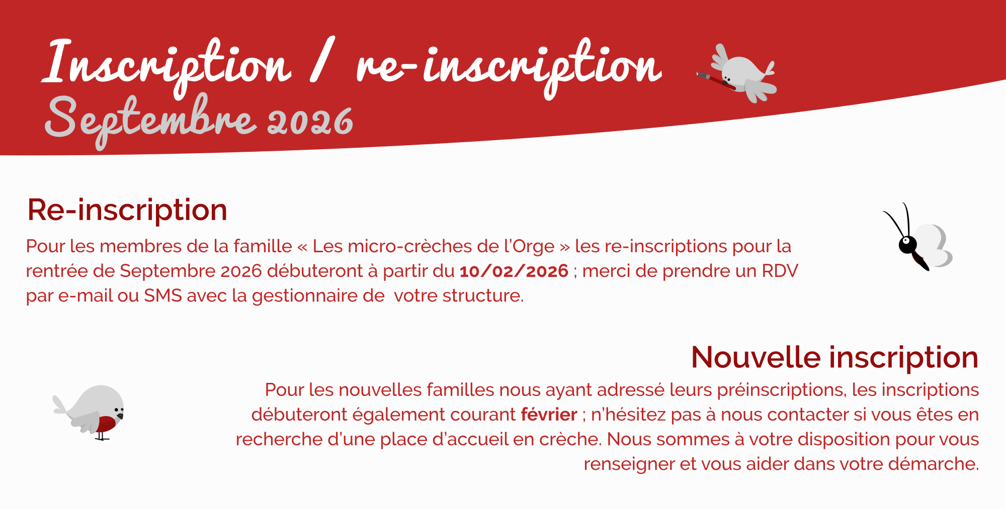 Régulièrement en cours d’année, des places à temps partiel ou complet se libèrent sur nos trois structures. Nous réalisons des pré-inscriptions et inscriptions tout au long de l’année en fonction des places disponibles. Vous trouverez ici toutes les informations complémentaires ainsi qu’un formulaire de demande d’informations.
